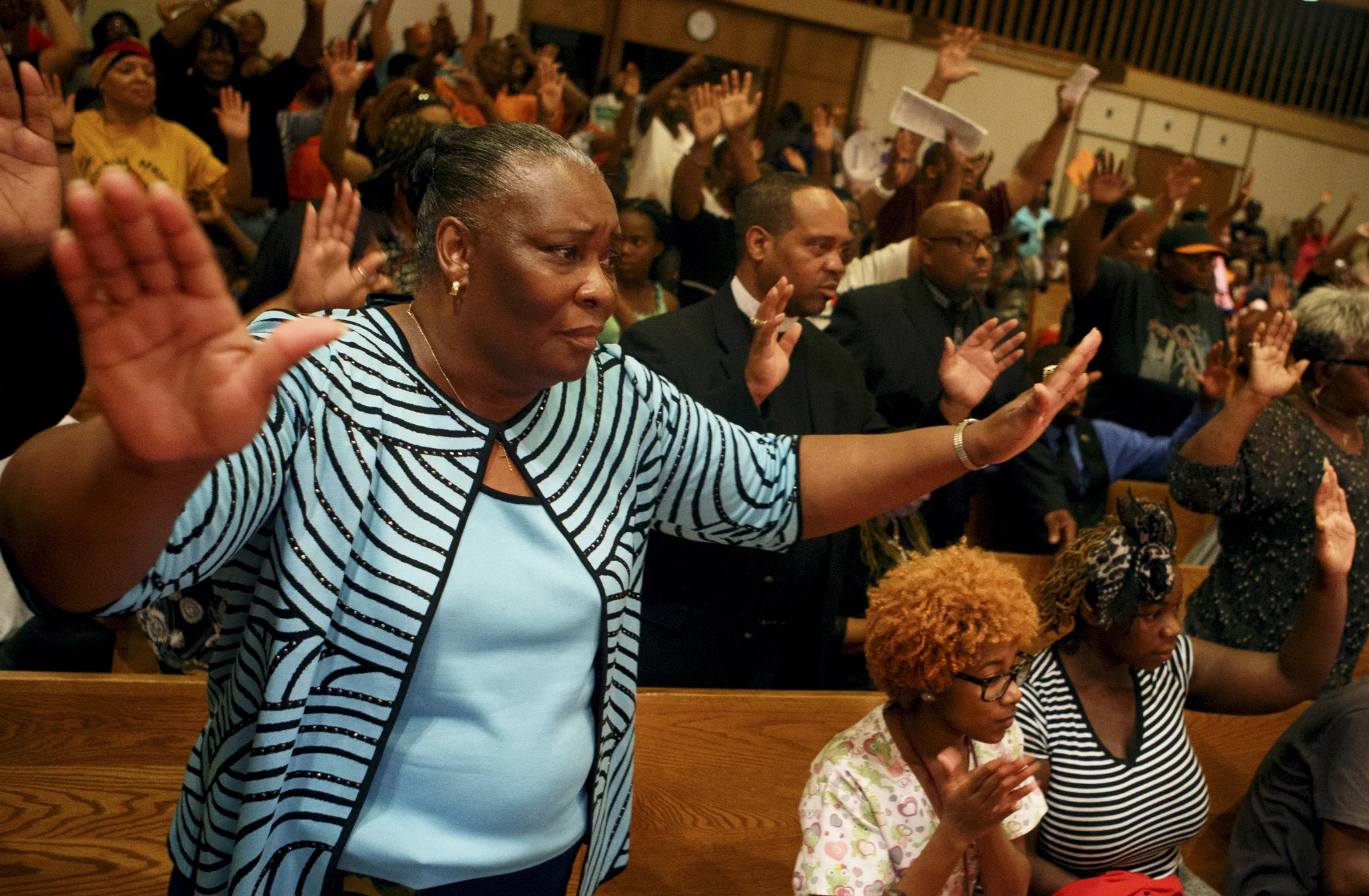During a rally at the Greater Saint Mark Missionary Baptist church, guests raised their hand in prayer in response to the death of Michael Brown on Aug 12 2014 in Ferguson, Mo.