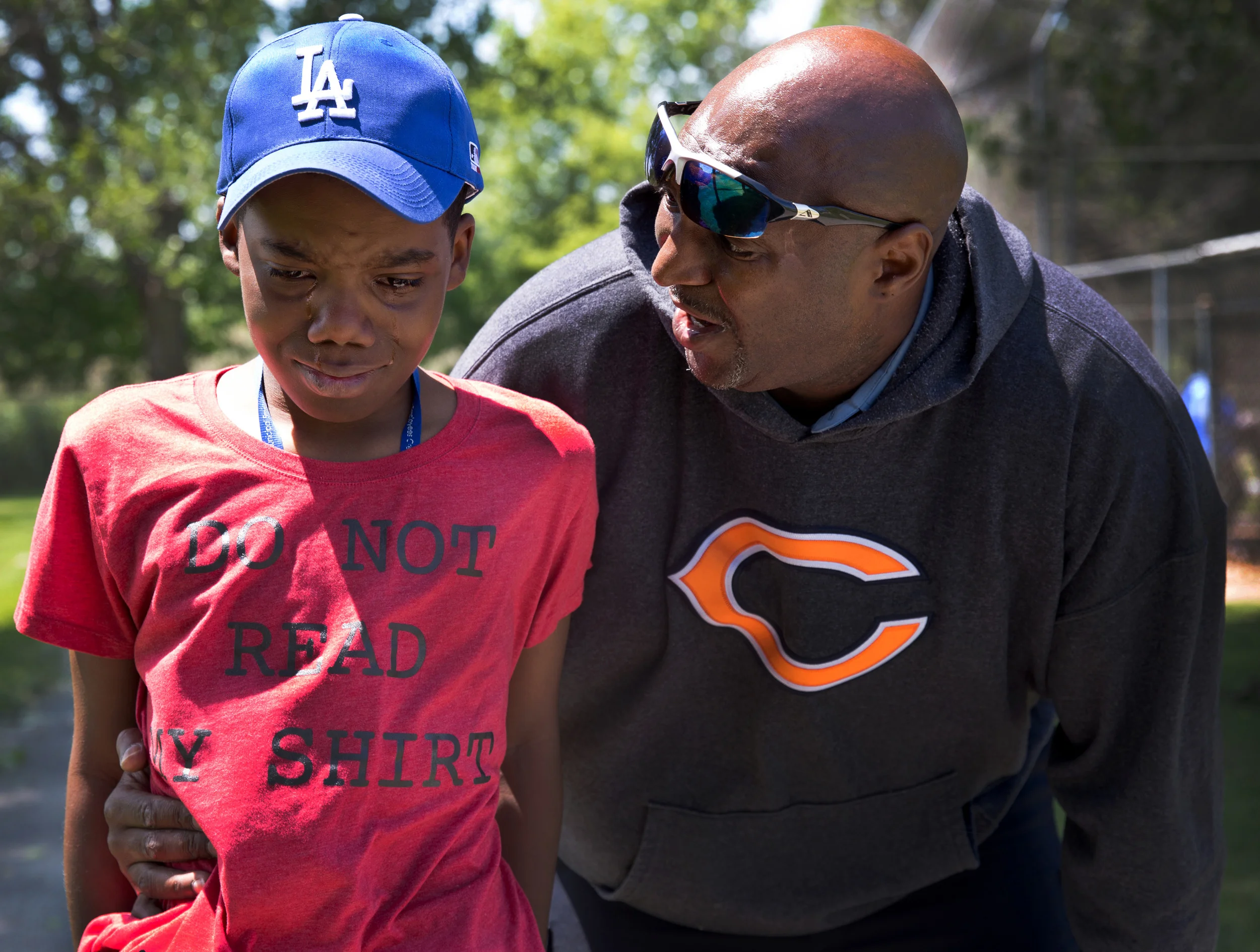 Coach Rick Bolin (right) encourages Josiah while he cries. Josiah is told that he could not play baseball with the bigger team due to lack of experiance. "Dont give up son, if you keep practicing one day youll be ready" Bolin said