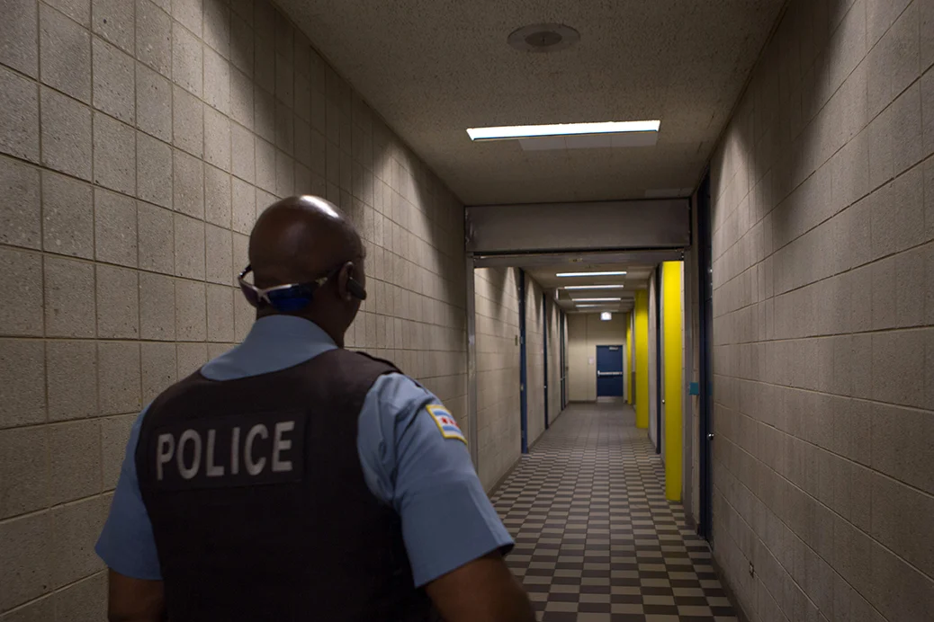 5th district officer Rick Bolin enters the police station for his shift.