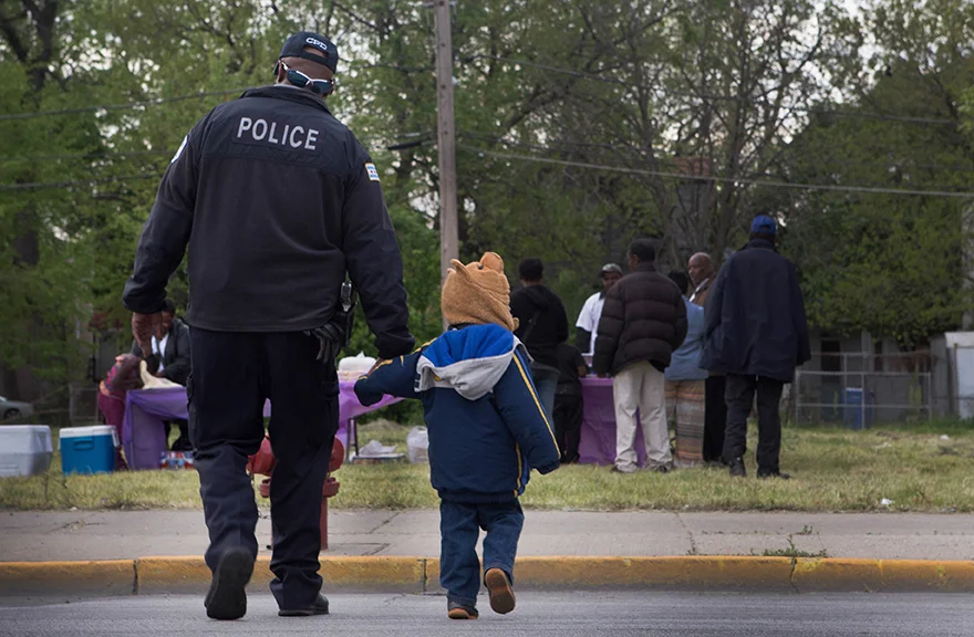 Officer Bolin walks a Roseland community youth across the street during an event that was held to stop the violence in the community on May 22 2014. Bolin serves as the Business Liason for CAPS (Chicago Alternative Policing Strategy) an organization formed between officers and the community to better serve the public.